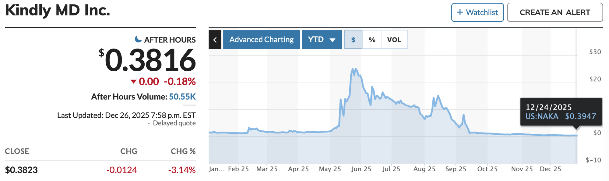 Other Bitcoin treasuries that issued equity to fund BTC buys often saw their stock prices rocket, then tumble just as fast. For instance, healthcare provider Kindly MD (ticker: NAKA on Nasdaq) is currently down 99% from its May peak of $25.