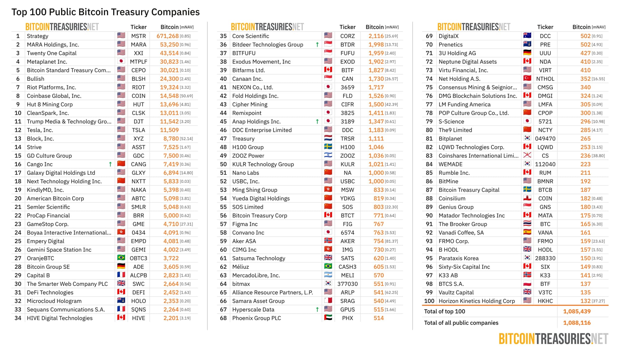 Many of those buyers took their cue from Michael Saylor's Strategy, which now boasts 671,268 BTC. The top three also includes miner Marathon Digital Holdings, Inc. (53,250 BTC) and Twenty One Capital, which is focused on providing Bitcoin-native services (43,514 BTC).
