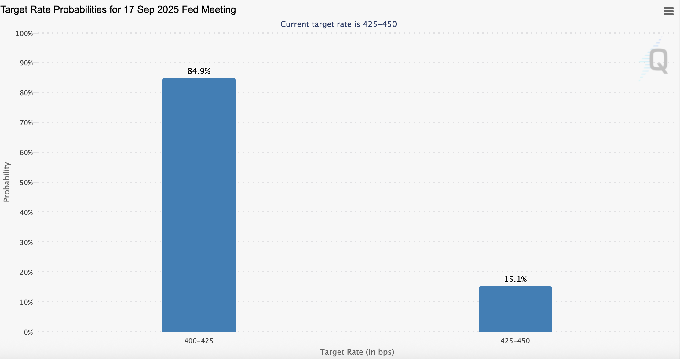 Traders see an 84.8% chance of a 25-basis-point Fed rate cut in September. Just over a week ago, it jumped to 98% after Treasury Secretary Scott Bessent urged for a 50-bps reduction, blaming the Fed for using flawed data.