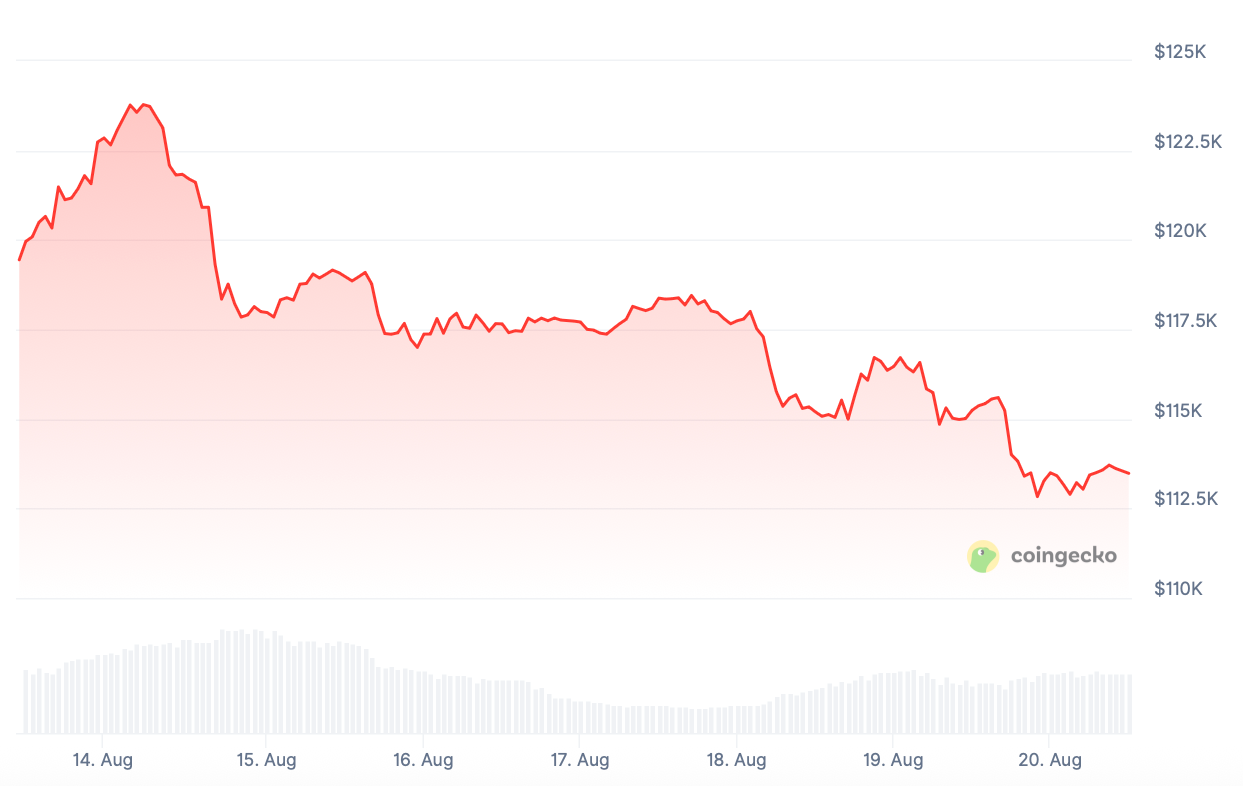 The BTC price shot up from $119k to an ATH of $124,128 last Thursday, Aug. 14, before sharply dropping to $117k, where it held through the weekend. On Monday, it slipped further, hitting $115k before plunging below $113k last night.