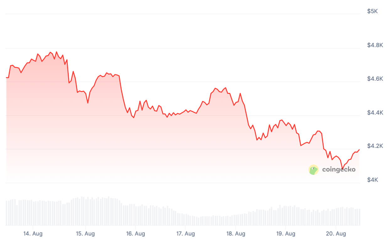 Mirroring BTC's momentum, ETH pushed to $4,774.06 last Thursday, Aug. 14, dropped below $4.5k, and fell further after failing to hold above $4.6k. It traded below that level over the weekend and continued to decline. The price sank through $4.2k last night and hit a low of $4,080.65 hours ago.