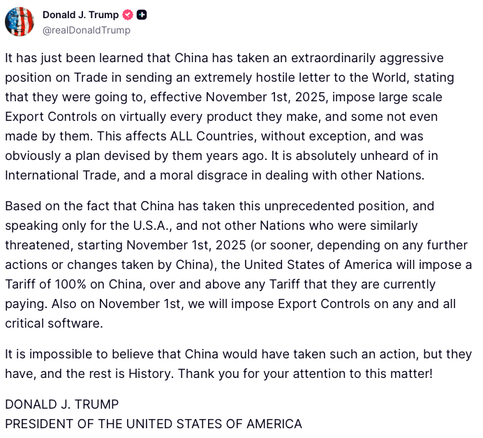 Following record single-day liquidations sparked by Donald Trump's 100% tariff threat on Chinese goods on Friday, October 10, BTC attempted to recover but tumbled again. Pressure from the US-China trade tension returned yesterday as Trump threatened China with a cooking oil embargo after making conciliatory remarks.