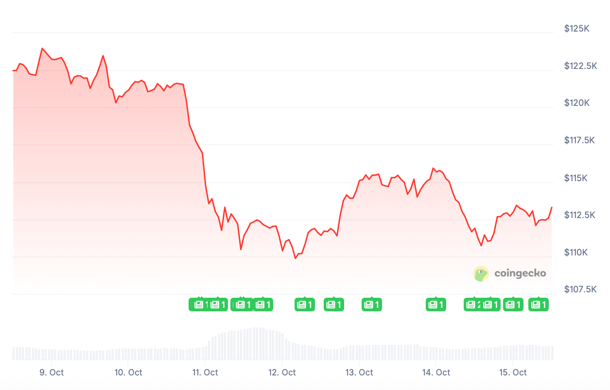 The BTC price breached $123k repeatedly before collapsing on October 10. The decline culminated in a 7-day low of $109,883 on Sunday, October 12. After a rebound to $115,934 the next day, BTC dipped back below $111k.