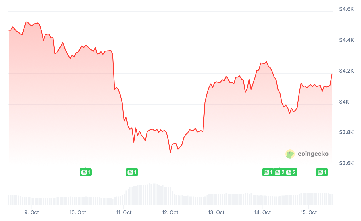 The ETH price topped out at $4,534.93 last Wednesday, October 8, before a steep collapse on October 10. On October 12, it fell as low as $3,686.83 before reversing. After a high of $4,277.17 yesterday, ETH fell below $4k again.