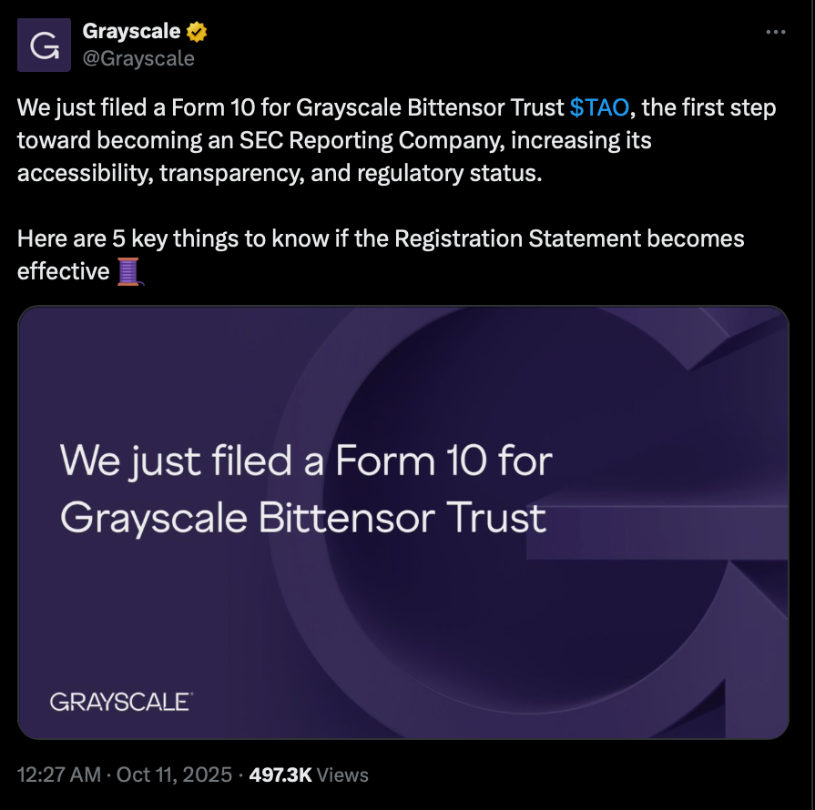 - TAO (+33.6%) rallied after Grayscale announced its Bittensor Trust ($TAO) filing with the SEC. This move represents the first step toward making TAO an SEC-reporting company, potentially enhancing its institutional credibility and market transparency.