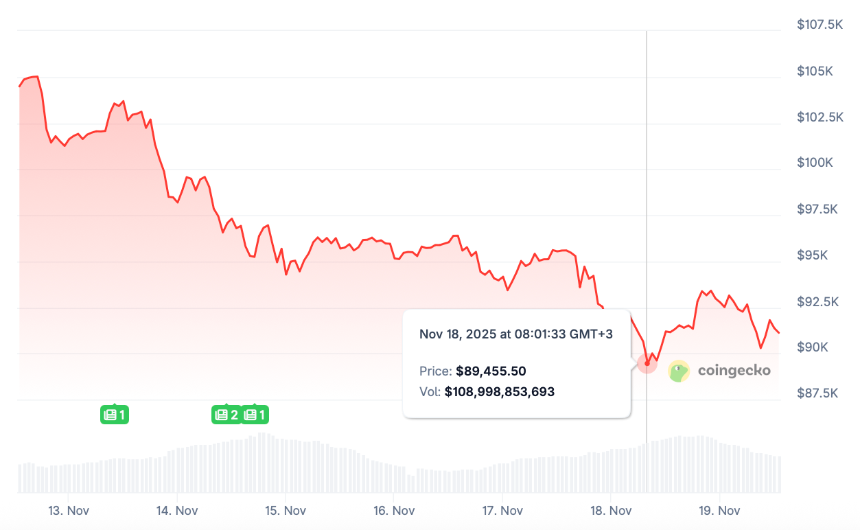 The price has sunk through the week, initially falling from $105,023 on November 12 to below $95K on November 15. After a slight recovery, it plunged further on Monday, November 17, and bottomed out at $89,455.50.