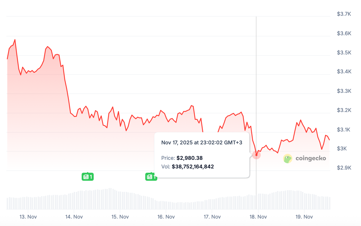 The ETH price reversed from a high of $3,580.29 on November 12 and nosedived below $3.2K the next day. Trading choppily, it struggled to recover for days before hitting $2,980.38 on Monday, November 17, and rebounding yesterday.