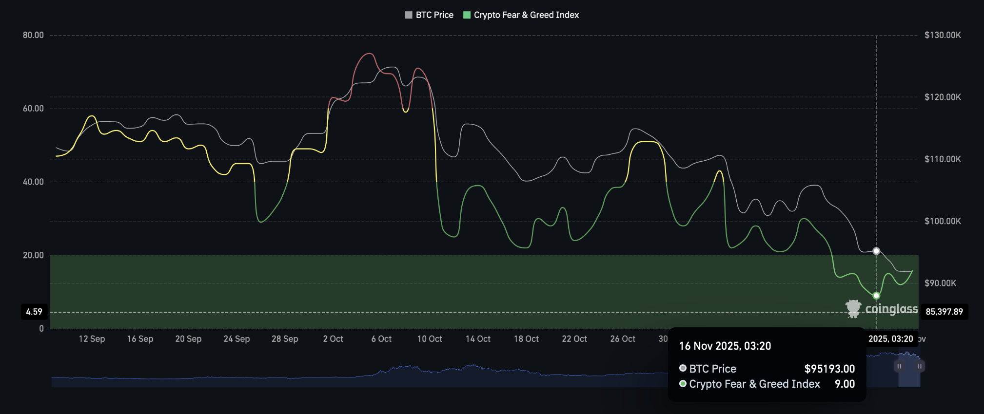 Major tokens extended last week’s losses on Monday amid a broader downturn in risk assets. Macro uncertainties, including renewed concerns about Fed interest rates and tech giants' spending on AI initiatives, soured sentiment. The Fear and Greed Index, now at 16, plunged to 9 on November 16 — its lowest level since mid-2022.