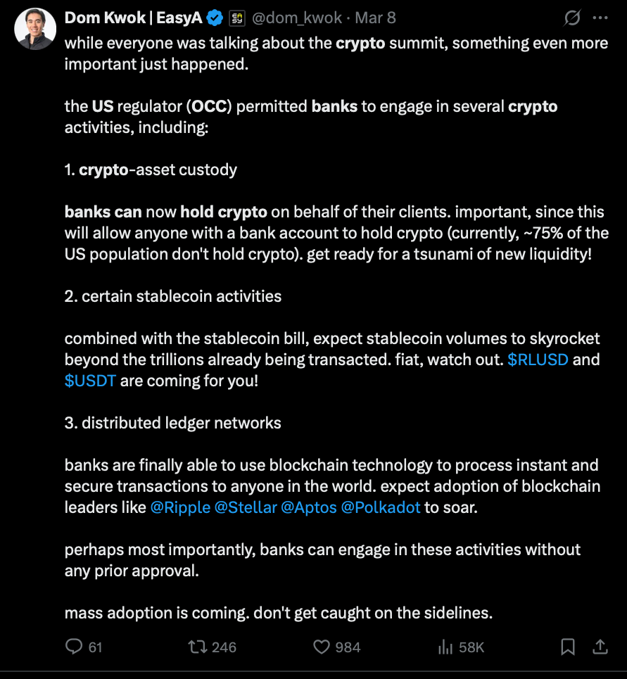 The current OCC, led by Trump appointee Jonathan Gould, has been actively reversing those policies. In particular, it has already cleared banks to custody crypto and engage in stablecoin activities.