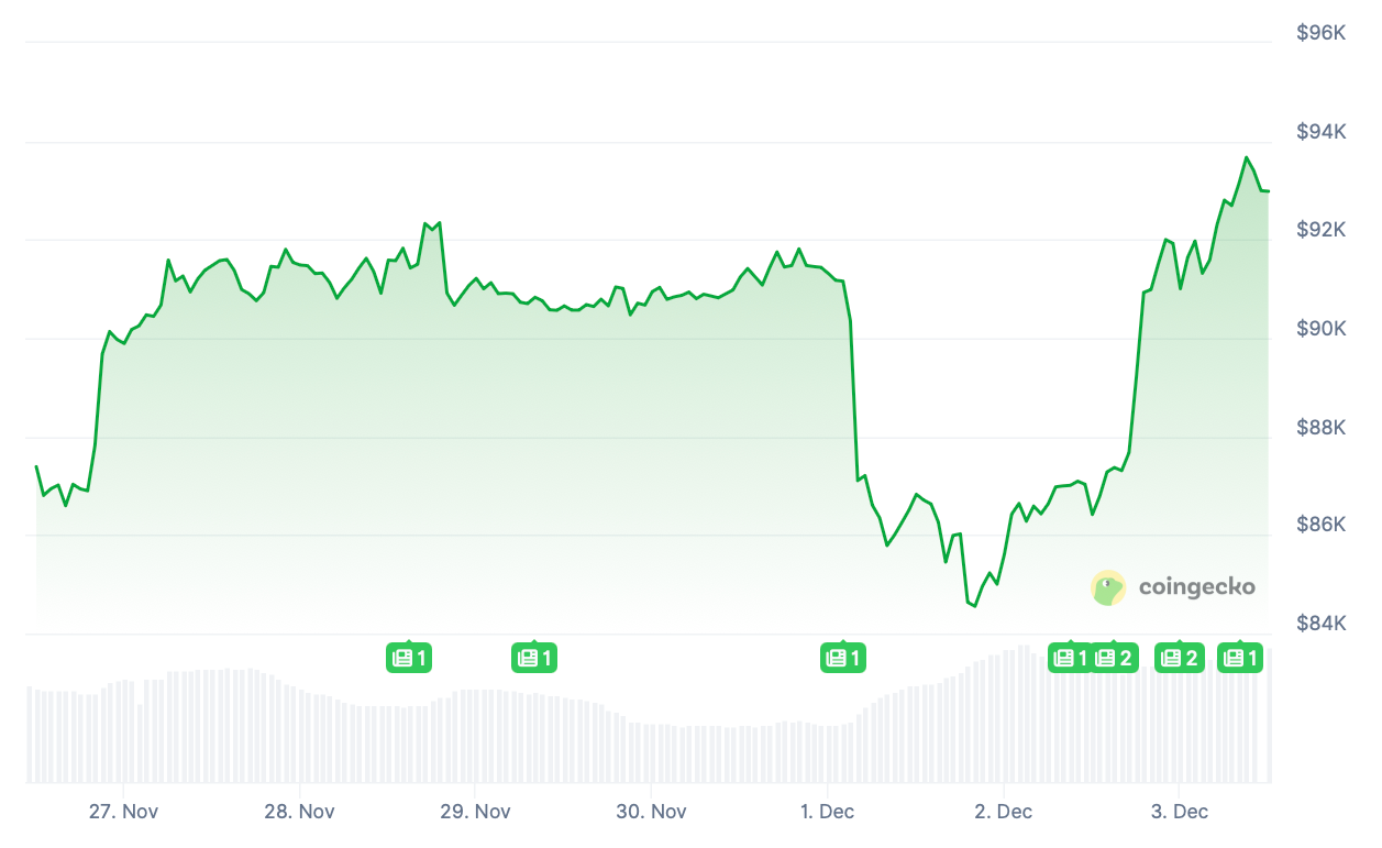 Currently at $92,980.71, BTC has gained 7.8% over the past 24 hours and 6.8% over the past week.