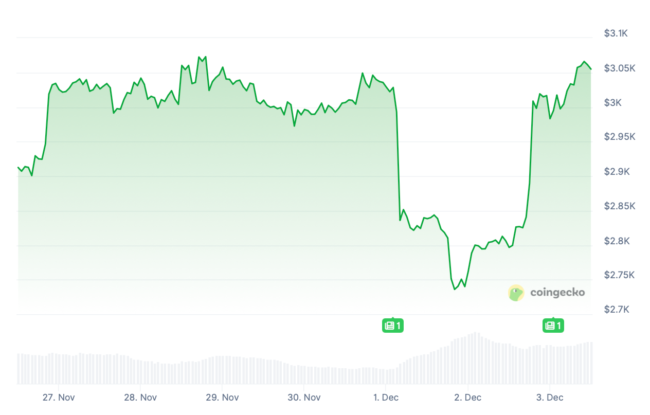 ETH closely followed BTC's path, initially rising from $2.9k to $3k and hovering around that level before the December 1 collapse. The price bottomed out at $2,740.42 on Monday, December 1, and sprang back, erasing the losses by December 3.