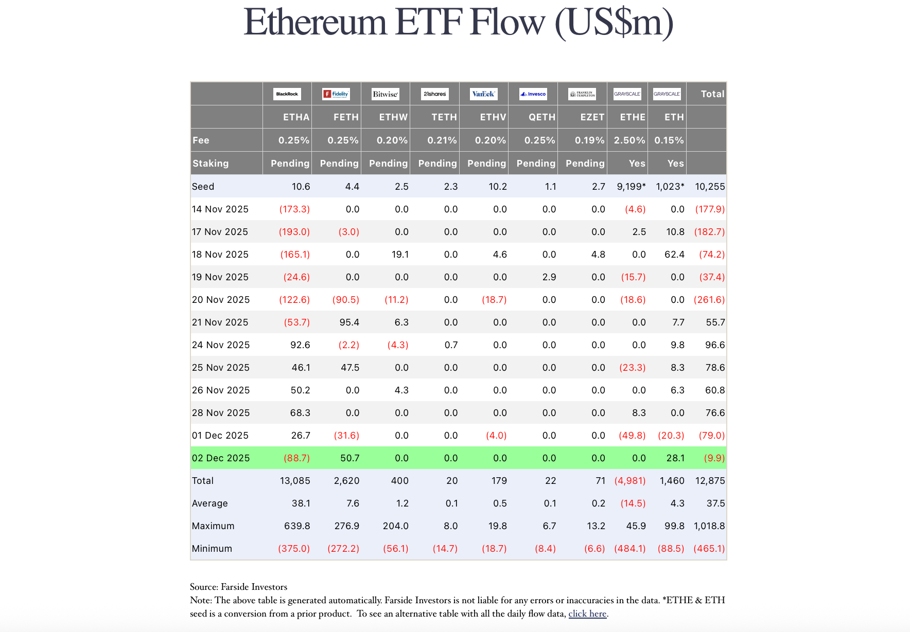 The news lifted spirits after a long stretch of outflows and stalled policymaking. Bitcoin ETFs have seen five straight days of inflows (totaling $288 million); outflows from Ethereum ETFs resumed on Monday, December 1, but decelerated from $79.9 million to $9.9 million yesterday.