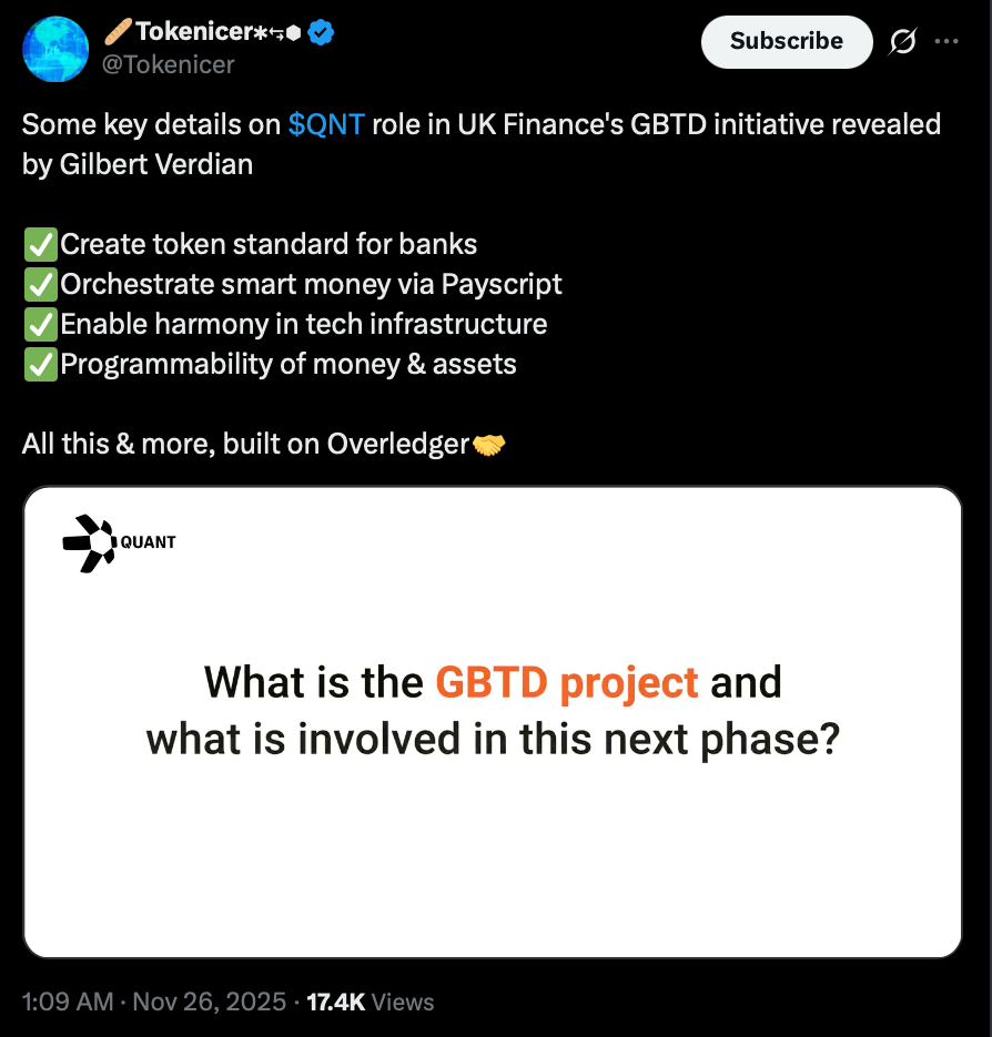 - QNT (+9.2%) rocketed and corrected as exchange and futures demand soared. Sentiment is boosted by QNT's role in the Tokenized Sterling Deposits (GBTD) initiative led by UK Finance, a trade body including financial giants like Barclays and HSBC.
