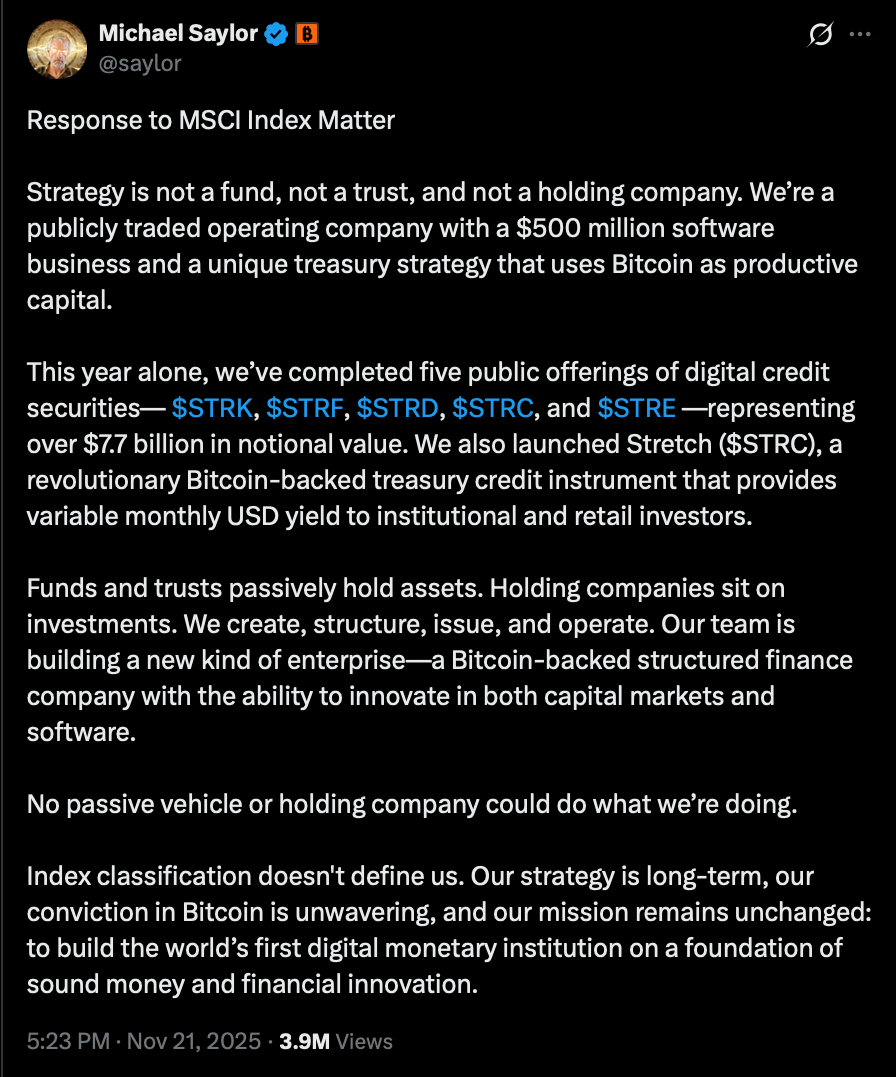 Last week, MSCI announced it was considering removing Strategy Inc. from its major equity indices, citing the firm's substantial Bitcoin exposure. JPMorgan and other market observers have also raised concerns about index eligibility concerns.
