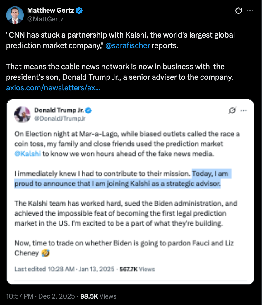 Furthermore, skeptics highlight Kalshi's connection to President Trump's son, Donald Trump Jr., who became its strategic advisor in early 2025.