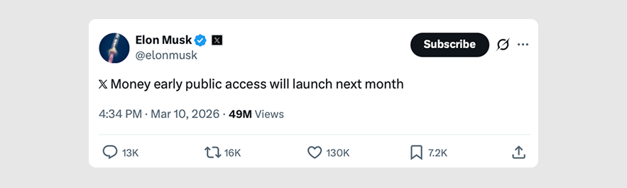 Elon Musk's long-awaited "everything app" is finally ready for its close-up. Early public access to X Money will launch next month, the billionaire confirmed Tuesday, marking a major milestone in his quest to transform the social media platform into a financial powerhouse.