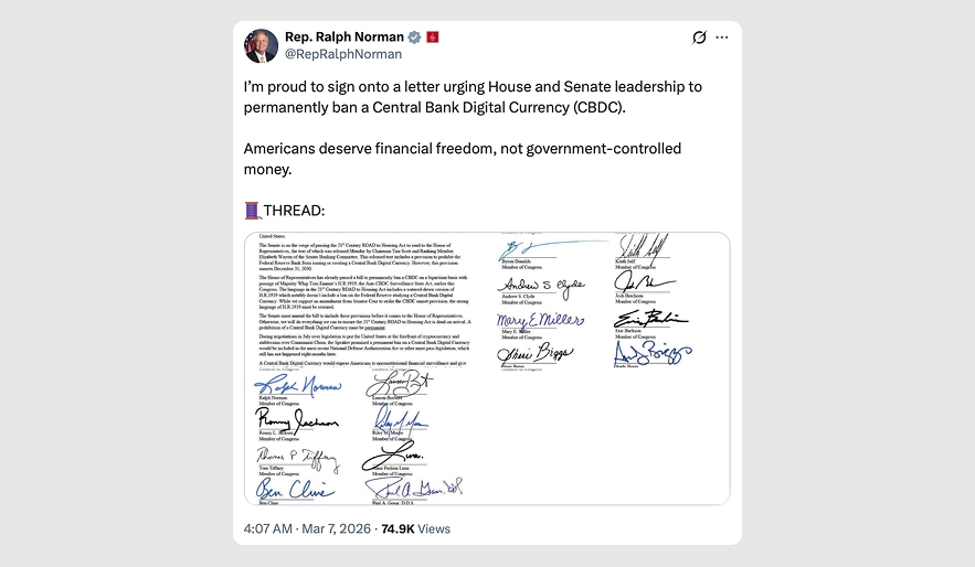 The push builds on last year's House passage of the Anti-CBDC Surveillance State Act, which prohibited the Fed from issuing a digital dollar directly to individuals. Cruz has long championed the cause, warning that a CBDC could let the government track every transaction.