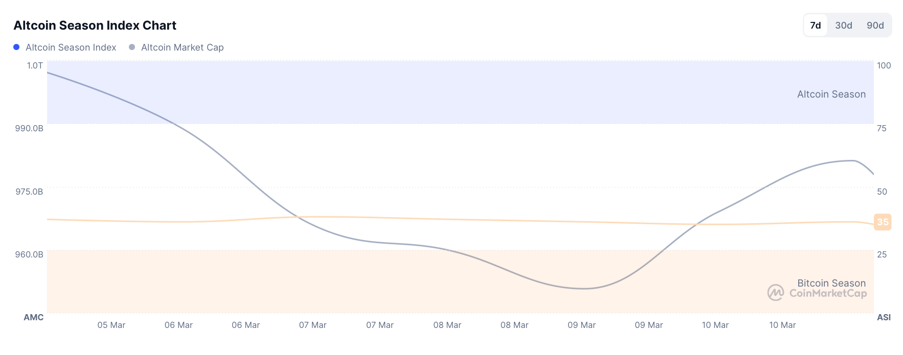 Bitcoin-led momentum continues to dominate the recovering market. Altcoin prices are lagging far behind, with the Altcoin Season Index stalling at 35/100 — firmly in Bitcoin season territory.