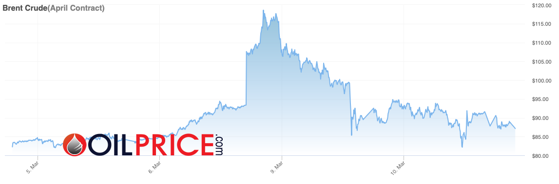 Both Brent and WTI prices have dipped — currently trading at $87.40 and $83.40 per barrel, respectively. On Sunday, March 8, April contracts for both grades topped $100.