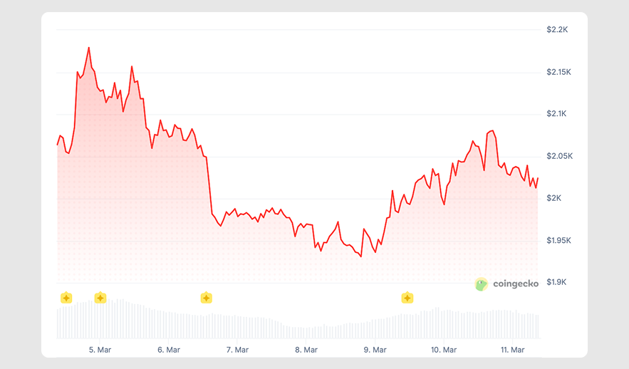 ETH tracked BTC's trajectory, nearly touching $2,180 on March 4 before declining. It fell below $2k on March 6, rebounded from roughly $1,930, and topped out at $2,018.71 on March 10. Since then, it's been trading lower.
