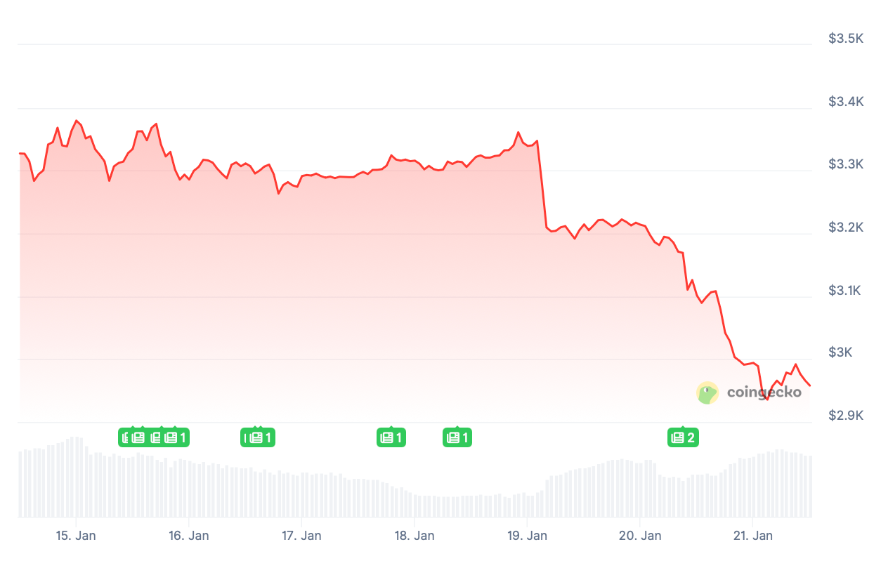 The price seesawed and stabilized around the $3.3k mark through January 17. A push to $3,361.02 on January 18 was short-lived, as ETH plunged to $3.2k the next day and sank deeper. Eventually, ETH bottomed at $2,935.62 a few hours ago.