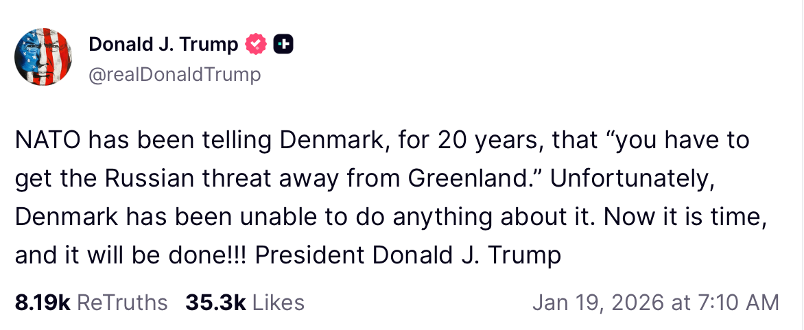 All eyes are now on Trump's scheduled speech at the World Economic Forum in Davos for any further details on his Greenland strategy. For now, markets are bracing for volatility, with traditional safe-haven flows dominating the landscape and crypto caught in the downdraft.