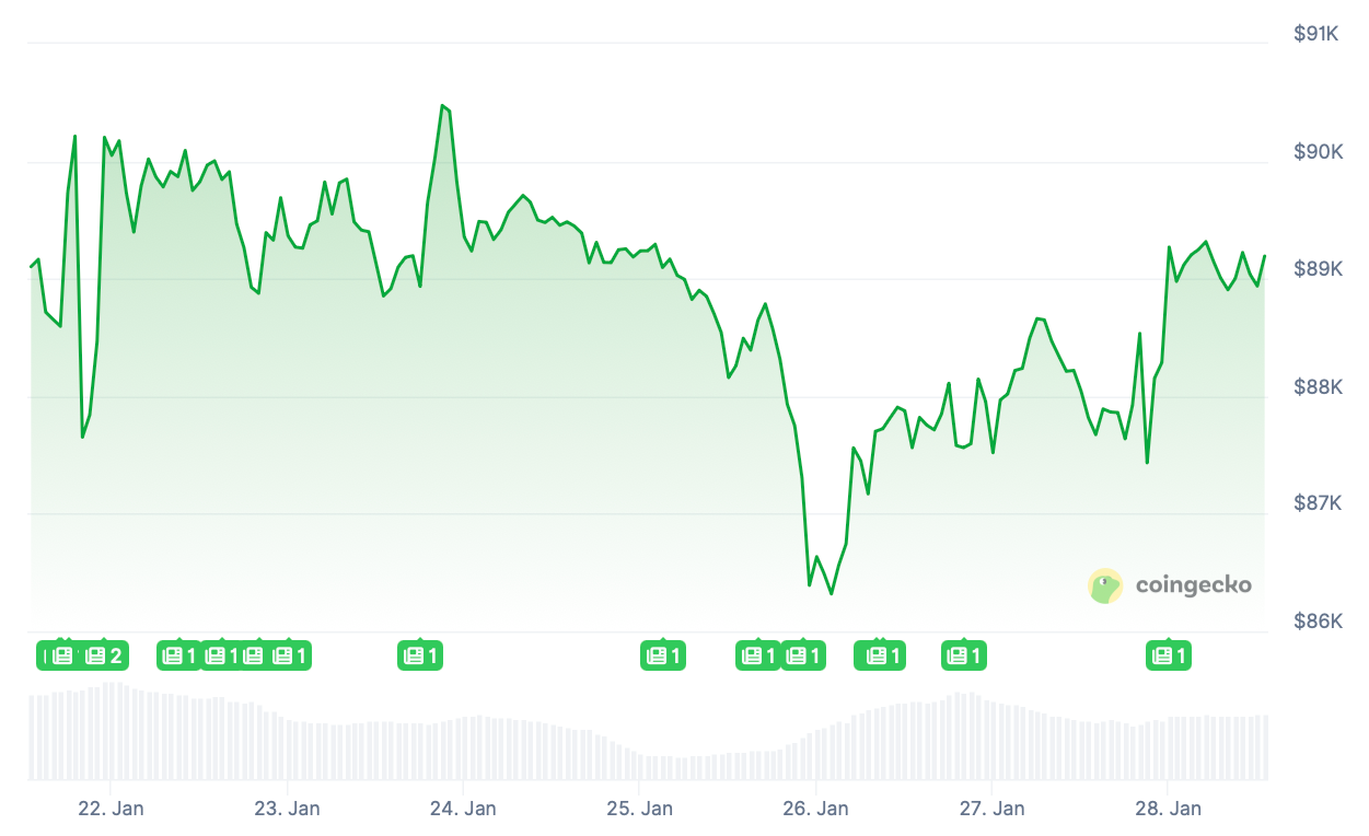 The BTC price slid from nearly $90k to $87,653.05 on Wednesday, January 21, bounced back above $90k, and seesawed lower. After Friday's hike to $90,475.02 came a steep weekend plunge. Recovering from Monday's low of $86,319.2, BTC reached above $89.3k a few hours ago.