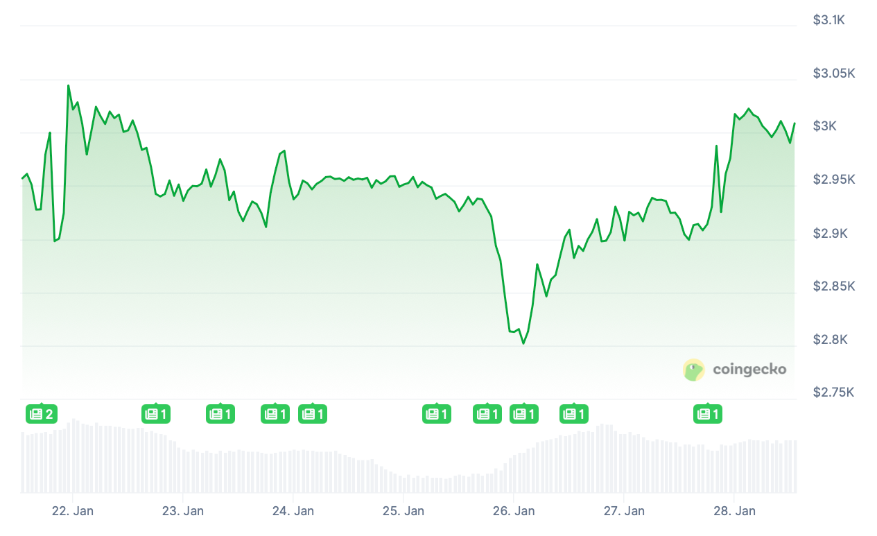 Unlike BTC, ETH peaked higher after dipping to $2,898.09 on Wednesday, January 21. The same day brought a weekly high of $3,044.41 before a gradual descent to $2.95k and a steep plunge lower. The price bottomed at $2,818.87 on Monday, January 26, and has since been climbing.