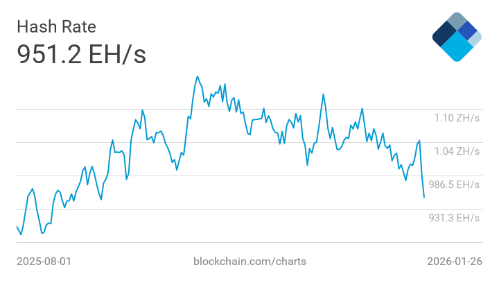 Bitcoin hashrate — the total computational power securing the blockchain — is down around 20% since mid-October, from around 1.2 zettahash per second (ZH/s) to 950 exahashes per second (EH/s).
