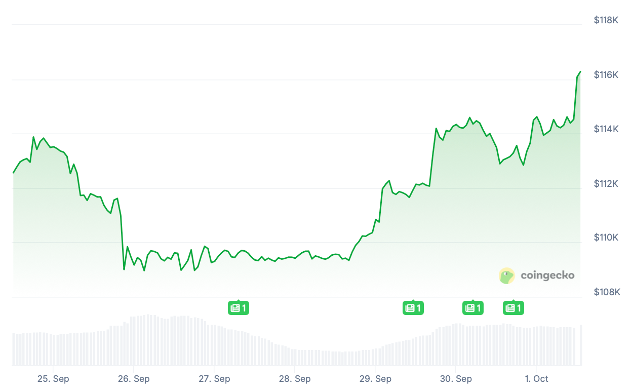 The BTC price nosedived from $113,874 to $109k last Thursday, September 25, and remained flat until Monday’s push above $112k. The rally appeared to fizzle at $114,592 yesterday but then resumed — rocketing minutes ago, BTC breached $116k.