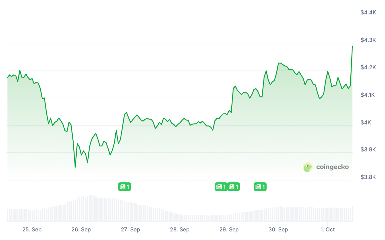 Mirroring BTC, ETH slipped from $4,192.21 and hit $3,846.41 last Thursday, September 25. It struggled to hold above $4k over the weekend and regained momentum on Monday — albeit temporarily. After yesterday's high of $4,225.65, the price retreated and surged again minutes ago.