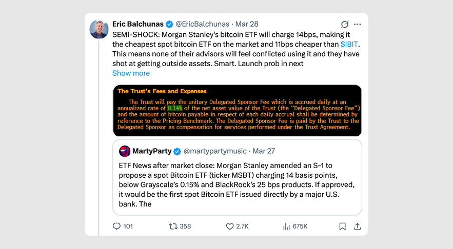 MSBT charges a management fee of just 0.14% — undercutting BlackRock's 0.25% and putting pressure on rivals to follow suit. VanEck currently charges zero under a fee waiver, but that expires in July. Grayscale's "Mini" product charges 0.15%. Morgan Stanley is right in the sweet spot.