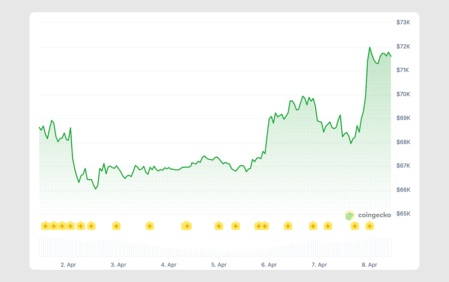 The BTC price rolled from under $69k to roughly $66,045 on April 2, then traded around $66k for three straight days. Monday's push on April 6 took it to nearly $70k before a brief retreat, followed by yesterday's explosive rally to $71,975.62.