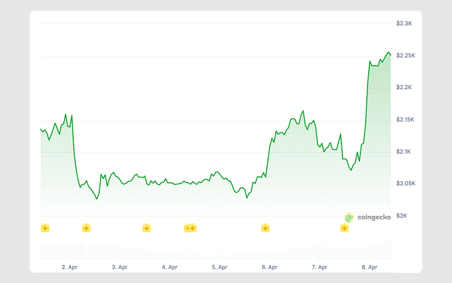 Echoing BTC's swings, ETH slid from over $2,150 to $2,026.62 on April 2 and hugged the $2k level for days. Another dip followed on April 5, then a rally to $2,164.40 on Sunday, April 6. After a brief retreat, it surged to $2,255.81 earlier today.