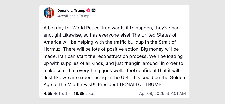 A two-week ceasefire in the Iran war, confirmed by Trump and Iranian officials, lifted risk assets on April 7. As crypto and US stock futures soared, oil prices declined by over 10% as fears eased over disruptions in Middle East energy supplies.