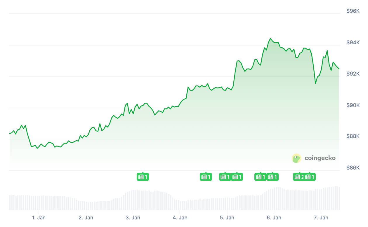 The BTC price bounced off a low of $87,526.24 on Wednesday, December 31, and rose steadily for five days. After peaking at $94,420.78 on Monday, January 5, it retreated, plunged to $91,544.95 the next day, and rebounded.