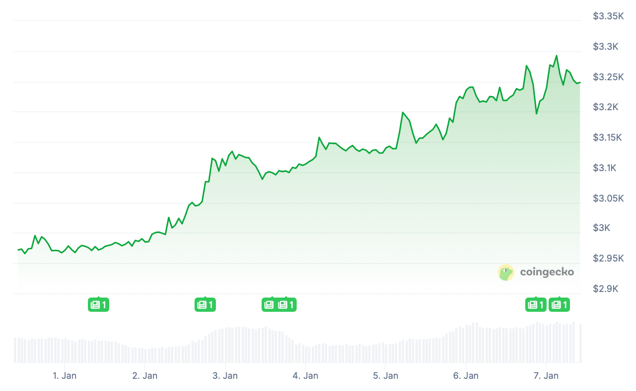 The ETH price closely followed BTC's ascent, rising from below $3k on Wednesday, December 31, to $3,275.89 a week later. After a brief plunge to $3.2k, it peaked at $3,292.52 a few hours ago.