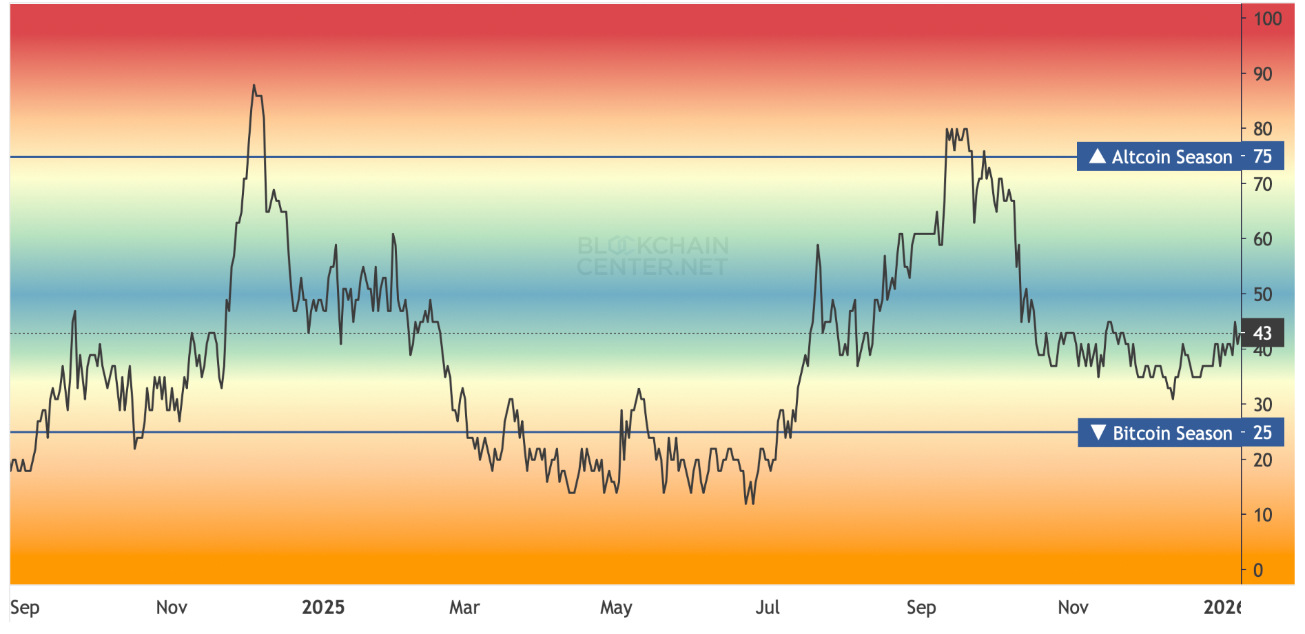 The Altcoin Season Index, recently at 23, has climbed to 43, shifting away from a pronounced Bitcoin-centric phase. Over $657 million in token unlocks this week could push more capital into alts, triggering a sustained breakout.