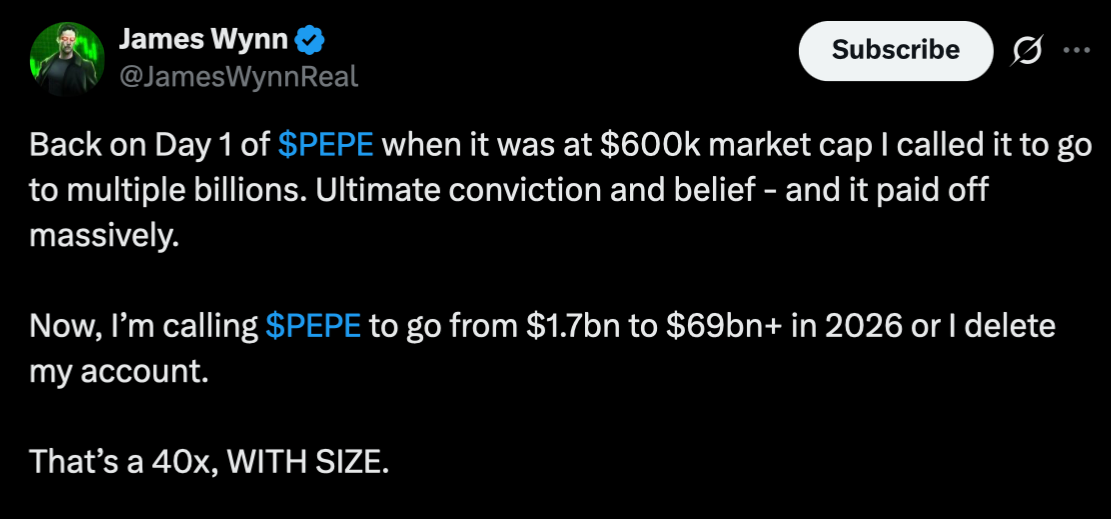 - PEPE (+60.7%) soared after crypto trader-influencer James Wynn predicted a $69 billion market cap in 2026, a 40x increase. Analysts warn that a rapid reversal is highly likely.