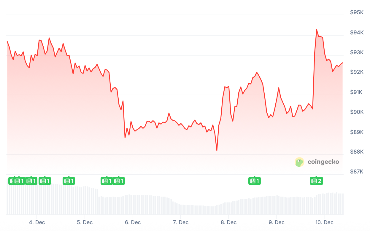 The BTC price slipped from $93k on Thursday, December 4, hit $88,838.81, edged back to $89k, then plunged to $88,202.39 on Sunday, December 7. Rebounding, BTC seesawed again — falling from $92k to $90k and topping out at $94,267.18 yesterday.