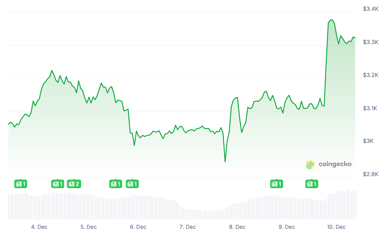 The price climbed to $3,222.40 on Thursday, December 4, and dropped below $3k as momentum fizzled. ETH held above this level until Sunday, December 7, when it bottomed out at $2,946.59. After reclaiming $3.1k, ETH rocketed to a high of $3,375.37 yesterday.