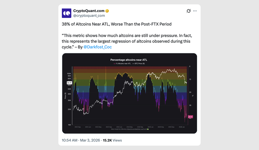 According to CryptoQuant, 38% of altcoins were trading close to their all-time lows on Tuesday, March 3, caving in under persistent structural pressure. This drawdown was deeper than during the post-FTX meltdown.