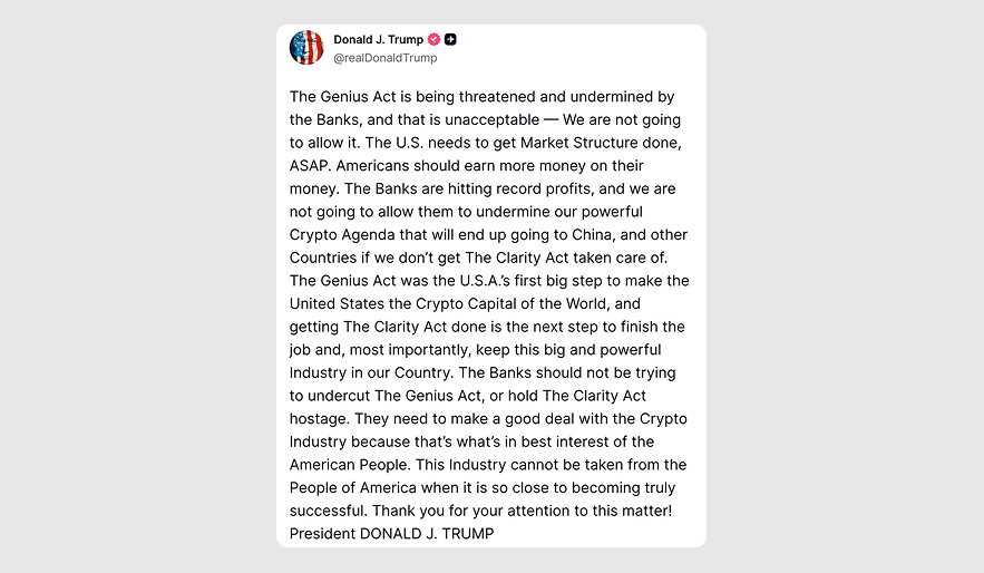 In a blunt Truth Social post Tuesday, Trump accused major banks of "threatening and undermining" the GENIUS Act — the stablecoin law already on the books — and holding the broader market structure bill "hostage." His message was unmistakable: pick a side, and soon.