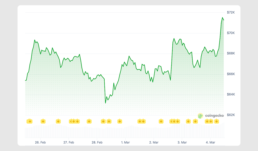 Currently at $71,276.10, BTC is up 6.5% over the past 24 hours with a gain of 9.1% over the past 7 days.