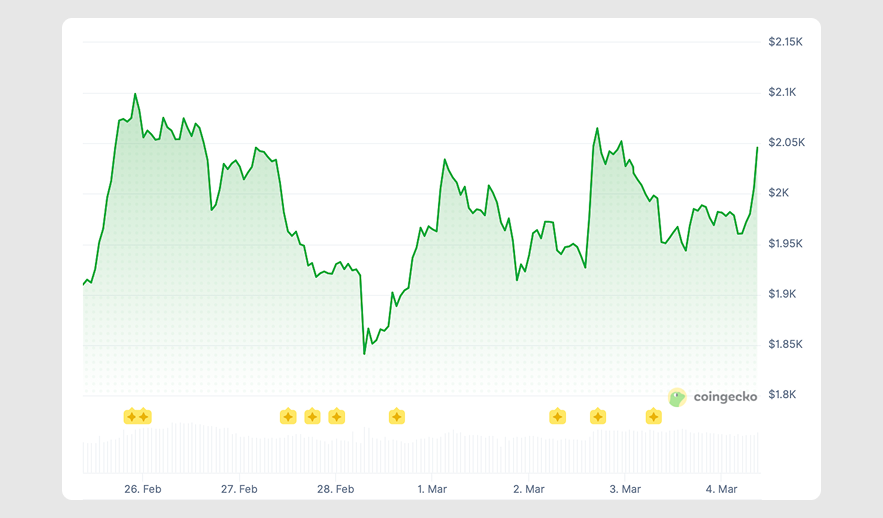 Tracking BTC, ETH bounced from $1,884.95 on February 25 and approached $2,100 the following day. After a multi-day pullback, it fell to $1,866.40 on March 1, briefly reclaimed $2k, and later peaked near $2,065 before attempting another recovery today.