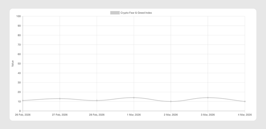 The Fear & Greed Index has teetered between 10 and 14 over the past week, reflecting extreme fear amid the renewed Middle East turmoil. Spiking oil prices and sinking stocks accompanied crypto's broad downslide after the swift weekend bounce.