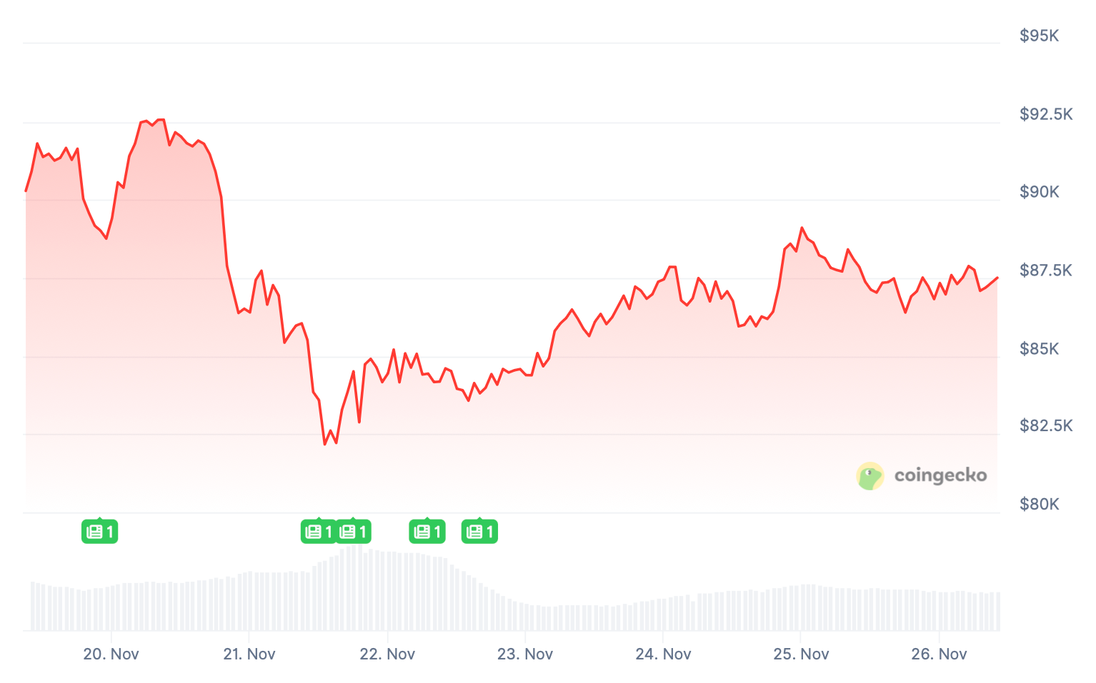 The BTC price briefly breached $92.5k on Thursday, November 20, before a steep plunge that culminated in $82,175.40 the following day. Rebounding, the coin rose gradually to $89,111.75 yesterday, November 25, then lost steam and stabilized around $87.5k.