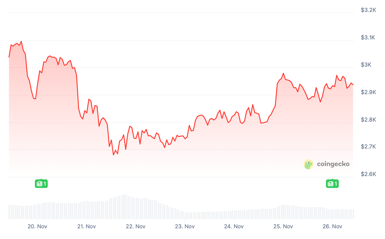 Now at $2,933.40, ETH is up 4.0% over the past 24 hours but down 6.0% over the past 7 days.