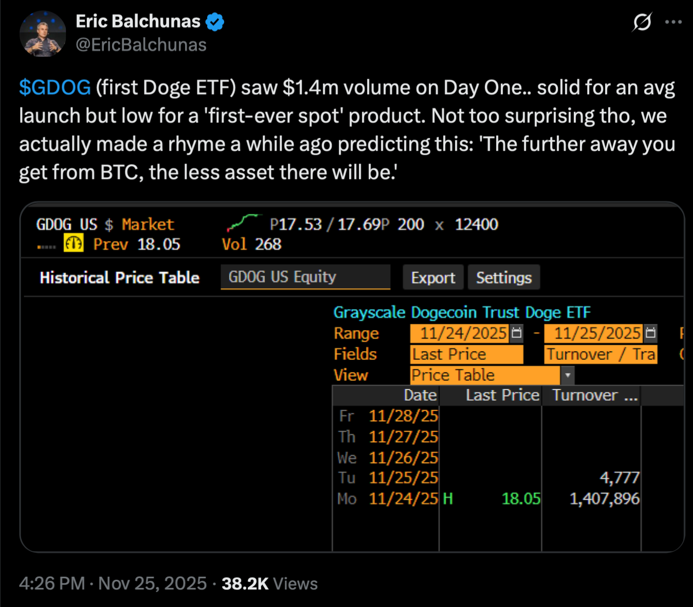 The initial numbers were undeniably soft. GDOG recorded a first-day trading volume of just $1.41 million, a figure that Bloomberg’s ETF expert Eric Balchunas noted was “solid for an avg launch but low for a 'first-ever spot' product.”