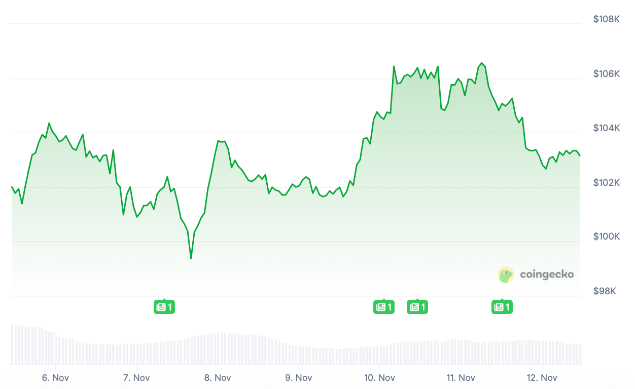 BTC briefly rose past $104k on Thursday, November 6, and bottomed out at $99,376.95 the next day. Rebounding, the coin traded close to $102k before surging past $106k on Monday, November 10 — culminating in yesterday's 7-day high of $106,562 and another decline.